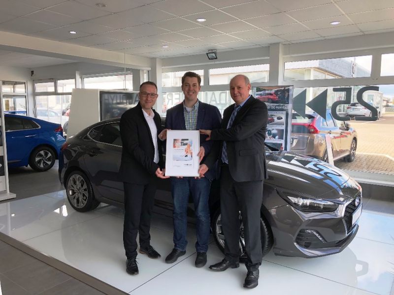 Bild: Feierliche Übergabe der Auszeichnung. v.l.n.r.: Robert Danz (Real Garant), Marc Prengel (Auto-Zentrum-Prengel), Stefan Linke (Hyundai Motor Deutschland)